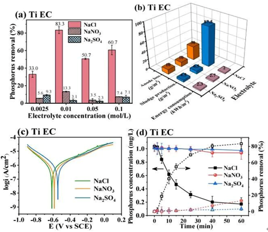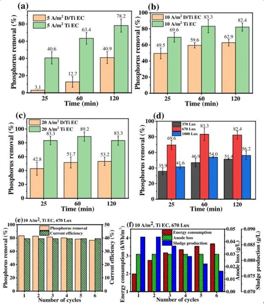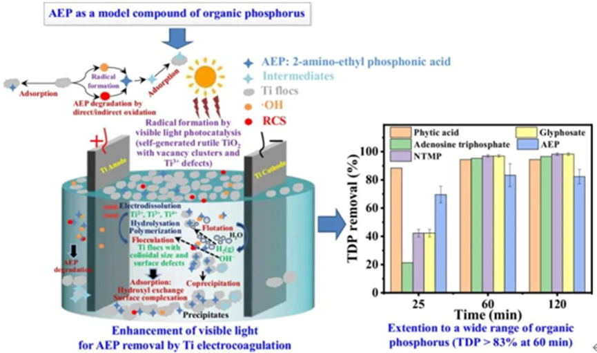 磷是引起水体富营养化的主要污染物,除正磷酸盐以外,水中的有机磷(OP)也可能引起富营养化,因而得到研究人员的关注,有机磷广泛存在于各类污水中,其C-P键稳定性高,与金属离子螯合后可能造成金属毒性增加。传统水处理技术(生物法、化学混凝法、吸附法等)通常对有机磷的去除效率低,操作过程复杂。电絮凝(EC)技术是一种有效的除磷方法,但传统铁、铝电极用于水处理时,可能引起水的色度或金属残留等问题,且以往研究只关注EC对正磷酸盐(sRP)的去除。钛(Ti)电极作为一种新型电极,安全无毒,其原位电解产生的TiO2可能产生光催化作用,强化对水中有机磷的去除,然而相关性能与作用机制尚不明确。