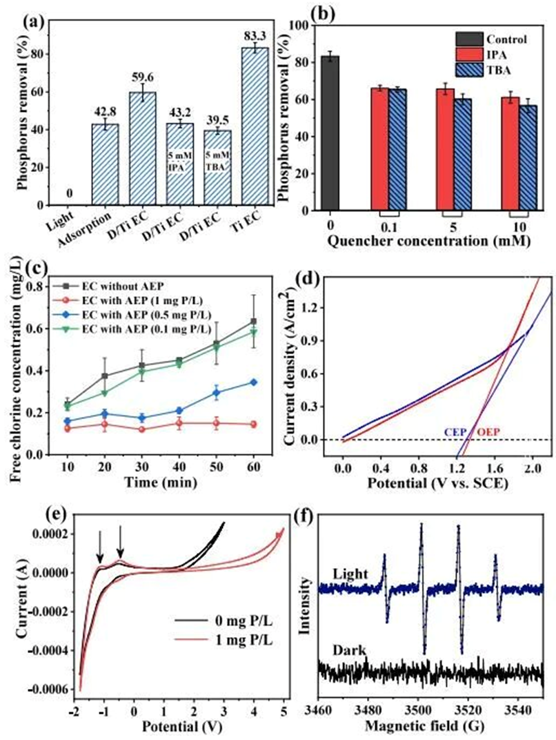 Fig. 4 (a) Comparison of AEP removal in light alone, adsorption, D/Ti EC, D/Ti EC (+ 5 mM IPA or TBA), and Ti EC process (60 min, 1 mg P/L, D/Ti EC: CD=10 A/m², Ti EC: CD=10 A/m², 670 Lux); (b) Effect of radical quenchers on the removal of AEP; (c) Free chlorine concentration; (d) LSV curves of Ti anode; (e) Cyclic voltammetry curves of Ti anode in 0.01 M NaCl with and without AEP; (f) EPR spectra recorded with and without light irradiation for DMPO-•OH.