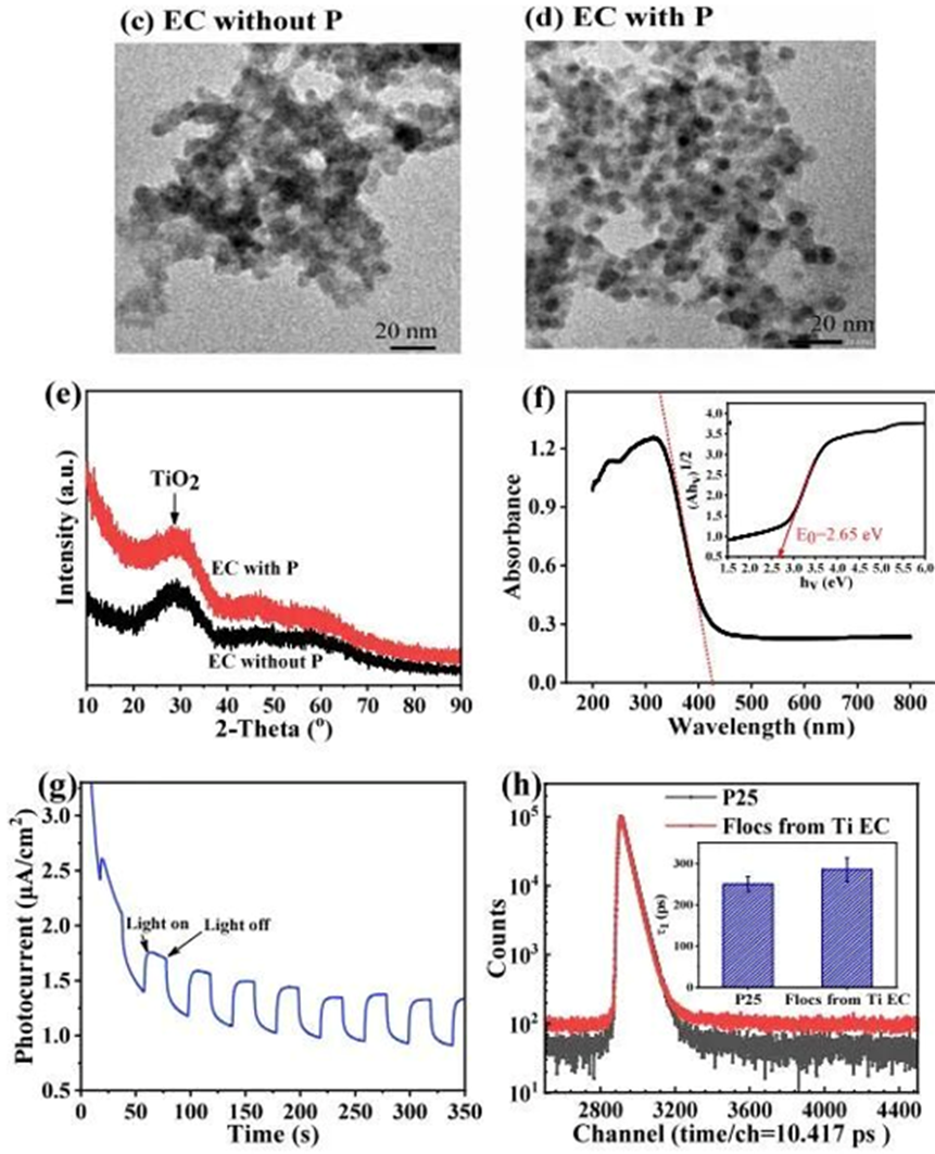Fig. 3 (a−b) Ferron complexometric analyses and ESI-TOF-MS spectra of Ti hydrolysates; (c−d) TEM images; (e) XRD patterns; (f) Diffuse reflectance spectra (DRS); (g) Transient photocurrent spectra; (h) Positron annihilation lifetime spectra and lifetime component for τ1 (inset) of P25 and Ti flocs (CD =10 A/m², 60 min).